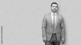 Portrait of well dressed Caucasian young man on light peach background
