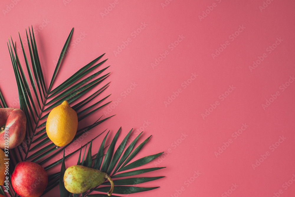 Summer tropical composition made with fresh fruit and green palm leaves on pastel pink background. Flat lay food.