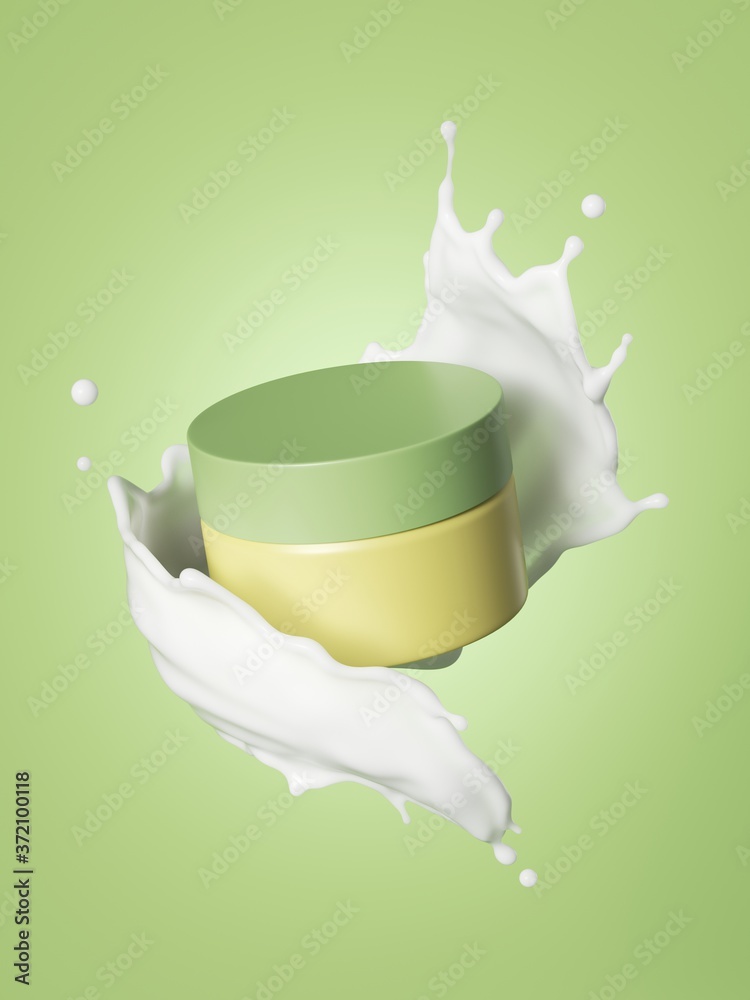 3d render, jar for cream levitate inside white liquid splash isolated on olive green background. Cosmetic banner template, package for skin care product, branding concept