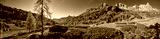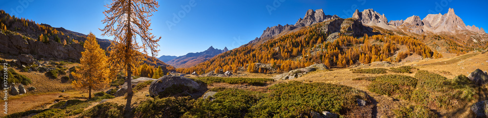 The Claree Upper Valley in full Autumn colors with golden larch trees and the Cerces Massif mountain range (Roche de Crepin and Pointe des Cerces). Laval, Hautes-Alpes (05), Alps, France