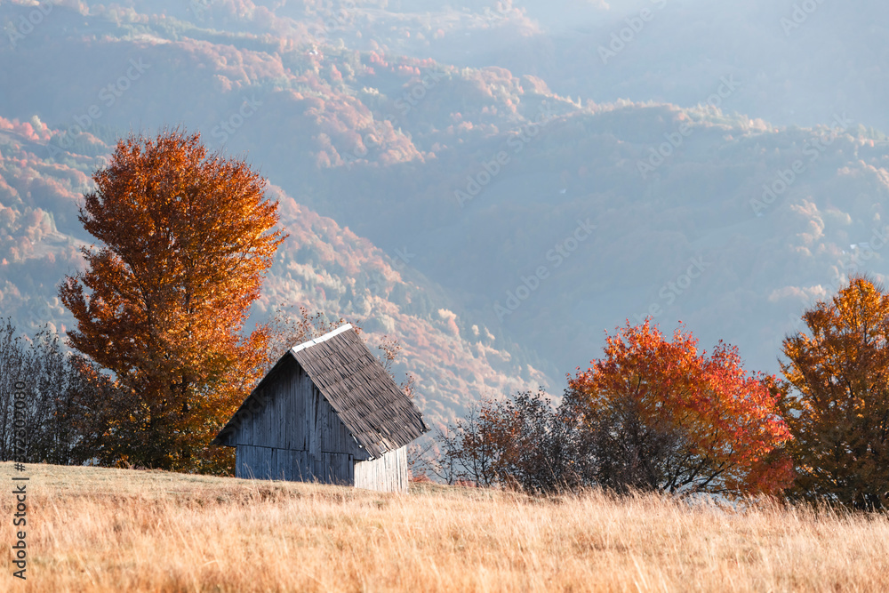 Picturesque autumn meadow with wooden house and red beech trees in the Carpathian mountains, Ukraine. Landscape photography