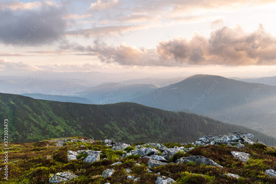 Amazing scene on autumn mountains. Grass and stones in fantastic evening sunlight. Carpathians, Europe. Landscape photography