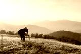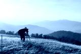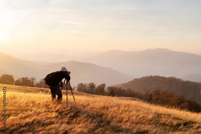 Photographer taking photo with tripod of autumn landscape with foggy peaks and orange trees. Ukrainian Carpathians mountains