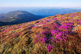 Rhododendron flowers covered mountains meadow in summer time. Purple sunrise light glowing on a foreground. Landscape photography