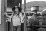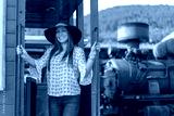 Beautiful brunet woman wearing black hat, boarding in train. Posing for camera. Old locomotive in background.