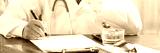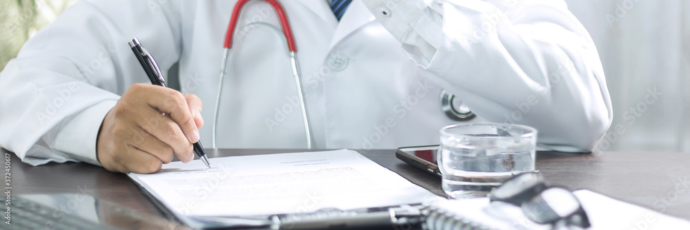 Close up hand of doctor, profession illness writing disease symptoms after researching and treatment patient on table