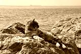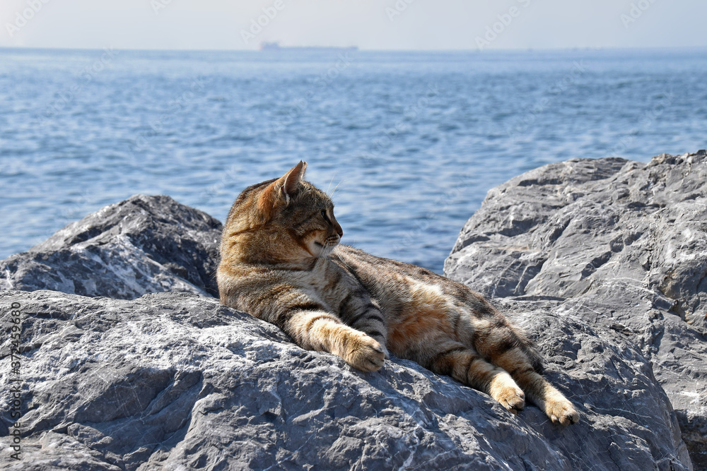 Tabby cat basks on the stones by the sea. Istanbul, Turkey