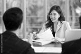 asian woman hr officer holding resume for job interview, considering man employee candidature for open work position
