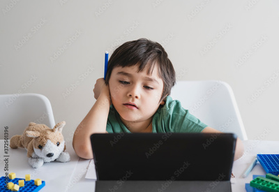 School kid in self isolation using tablet for homework,Child sad face lying head down looking out deep in thought, Boy stay at home during covid-19 lock down,.Social Distance learning online education