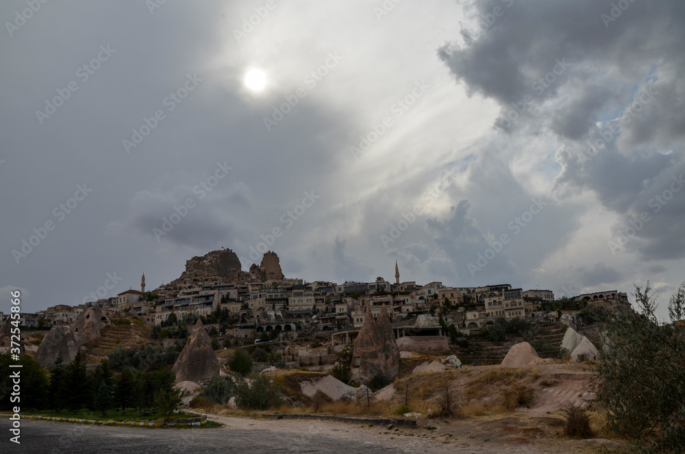 The town of Uchisar with highest building of Cappadocia the Castle Rock, Turkey