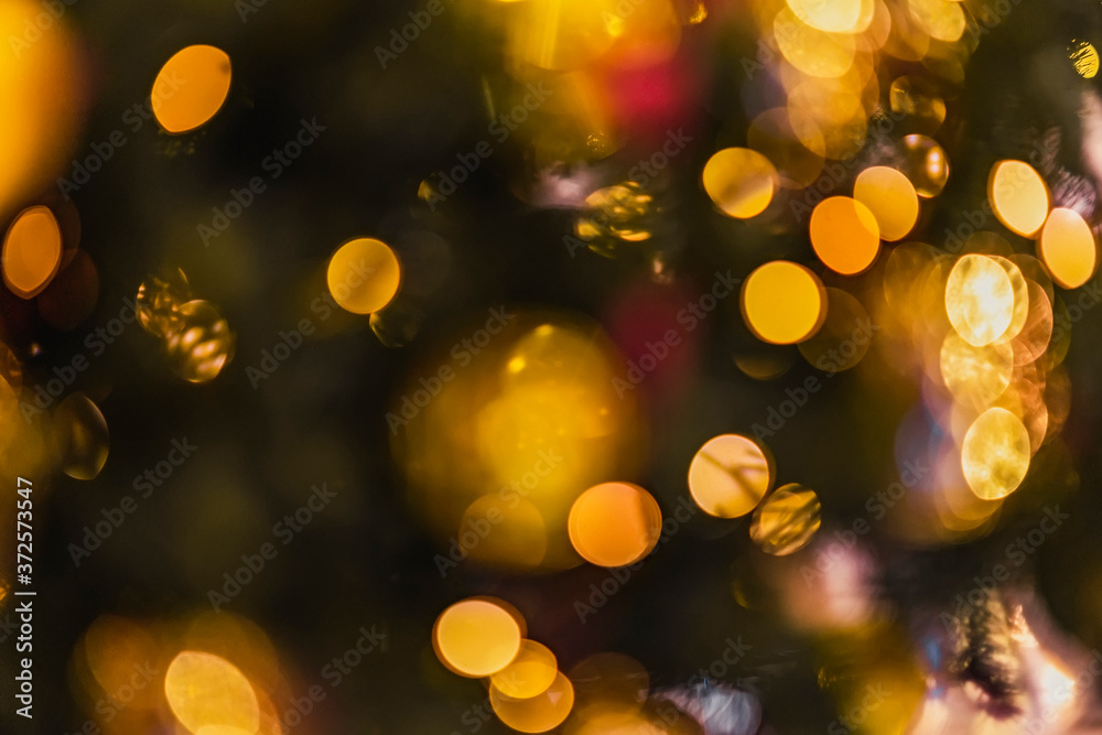 Abstract blurred christmas background with christmas tree decorated with shiny goden balls and illumination lights