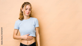 Young caucasian woman isolated on beige background touches tummy, smiles gently, eating and satisfaction concept.