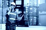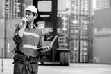 Industrial worker working at cargo freight logistic warehouse for import export, foreman use computer for online internet communication , Import and export business.