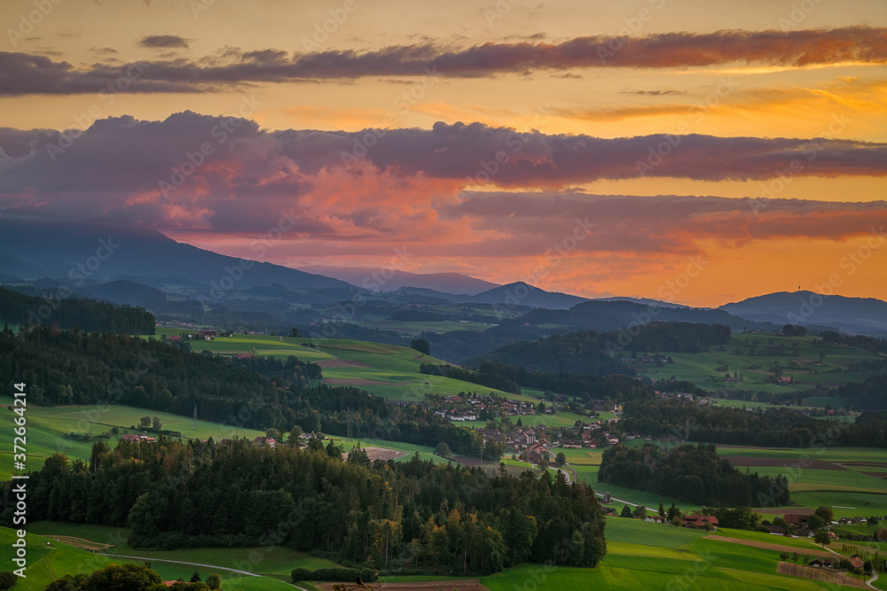 Bern during sunset with colorful sky and nice cloudscape. European mountain landscape, Switzerland, Bern.