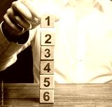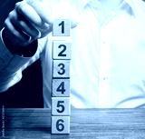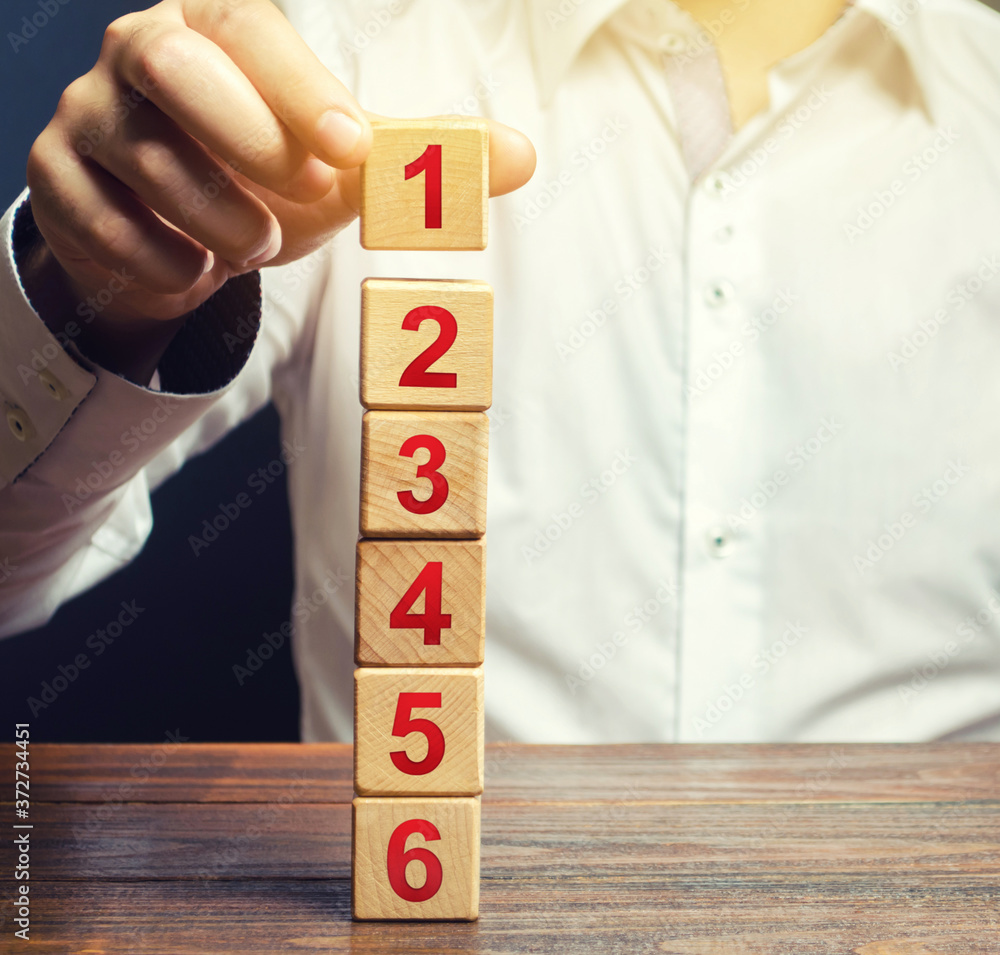 The man builds a tower of the sides of the numbers. Simple steps for execution. Organization and systematization, instructions. Business planning, action plan. Planning and tactics, alternate solution
