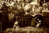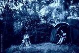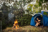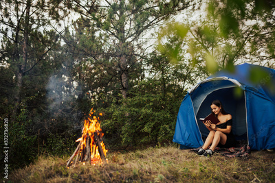 Girl hiker in the camping tent on a forest near bonfire reading book. Majestic landscape. Nature and education concept.