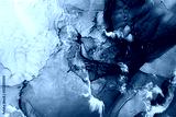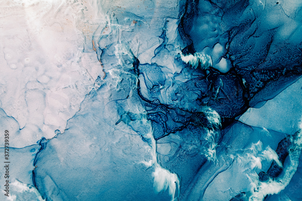 Blue acrylic ink. Marble texture. Frozen water surface with white snow effect. Fractured crystal ice rock abstract design. Mineral stone stained pattern. Nature art background.