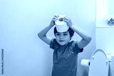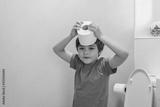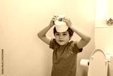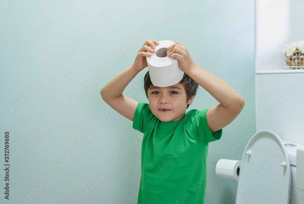 Cute boy sitting in the toilet playing with toilet paper,kid boy sitting in the restroom and putting toilet roll on his head, Child holding white tissue, Children health care concept
