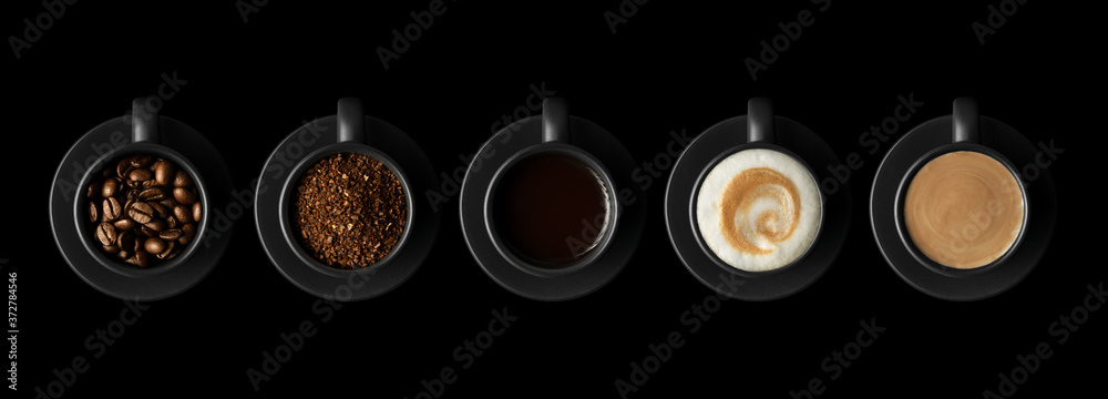 Five black cups with coffee and saucers on black background. Coffee beans, ground coffee, espresso, cappuccino and dalgona coffee. Flat lay.