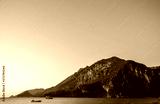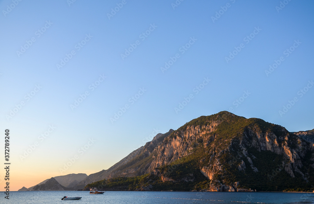 Beautiful orange sunrise on the Mediterranean Sea shore at Olympos coast, Cirali village, Turkey