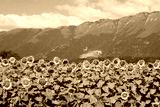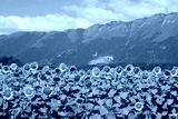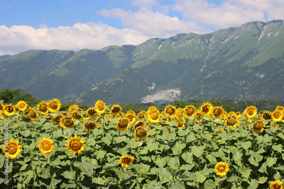 Sunflowers in bloom against blue sky. Helianthus annuus cultivation