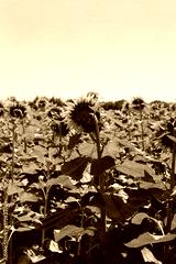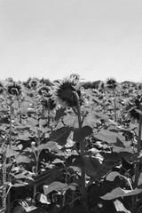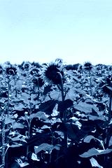 Sunflowers in bloom against blue sky. Helianthus annuus cultivation