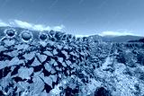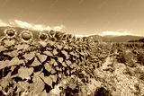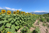 Sunflowers in bloom against blue sky. Helianthus annuus cultivation