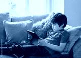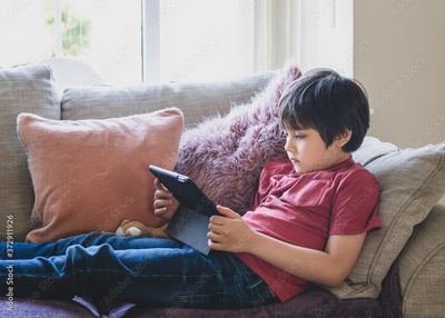 Mixed race kid sitting on sofa watching cartoons on tablet,Portrait 6-7 year old boy playing game on touch pad, Cute Kid having fun and relaxing alone in living room, New normal lifestyle
