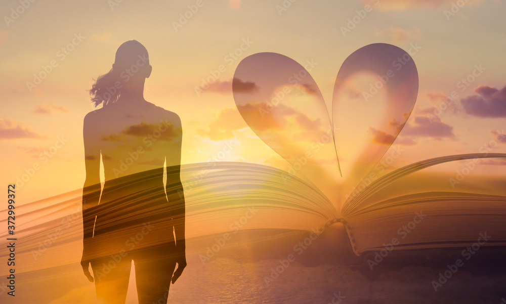 Female silhouette facing the sunset next to bible book with page shaped into heart. Love, religion, and spiritual concept.