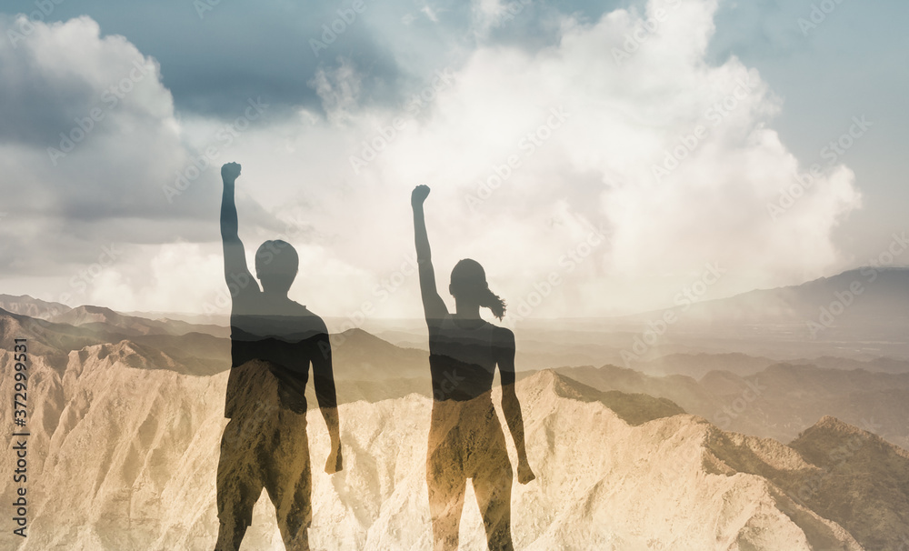 Strong man and woman on mountain with fist in the air. People, teamwork motivation, and strength concept.
