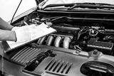 Auto mechanic using checklist for car engine systems after fixed. concepts of car insurance support and services.