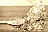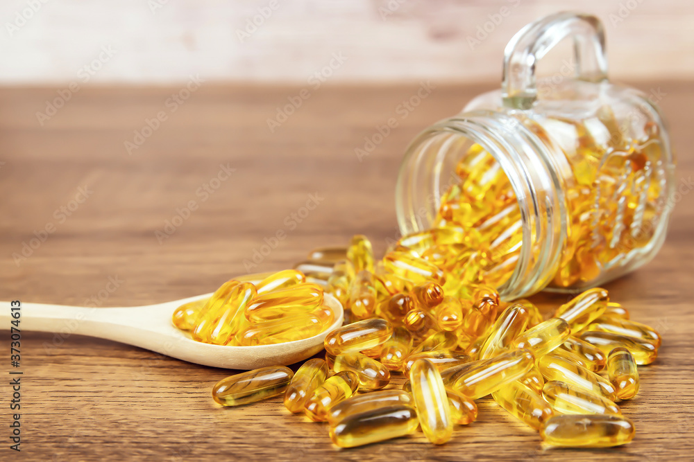 A pile of cod liver oil capsule in a wooden spoon. Dietary supplement for health-care concepts.