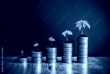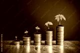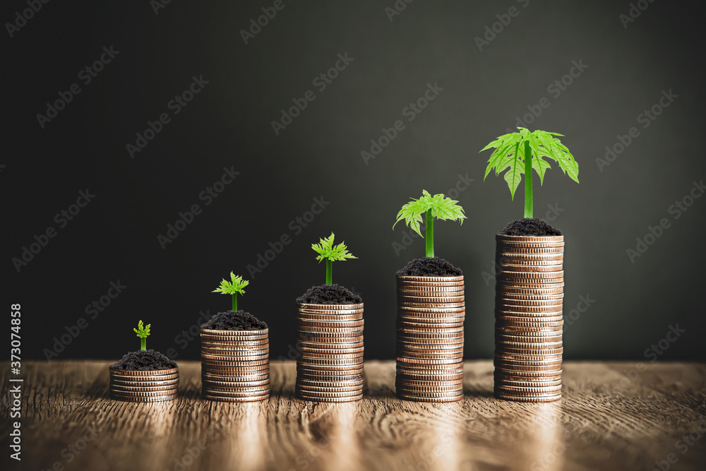 Pile of coins are stacked in a graph shape with trees growing for money saving ideas and financial planning insurance.