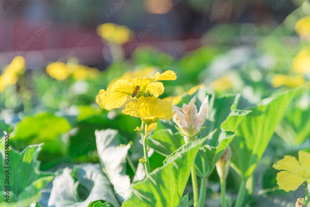 Bee pollination on blooming Luffa plant growing on pergola at homegrown garden near Dallas, Texas, USA