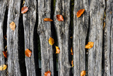 Old wooden grunge bridge with autumn leaves closeup. Natural texture. Can be used like nature background