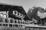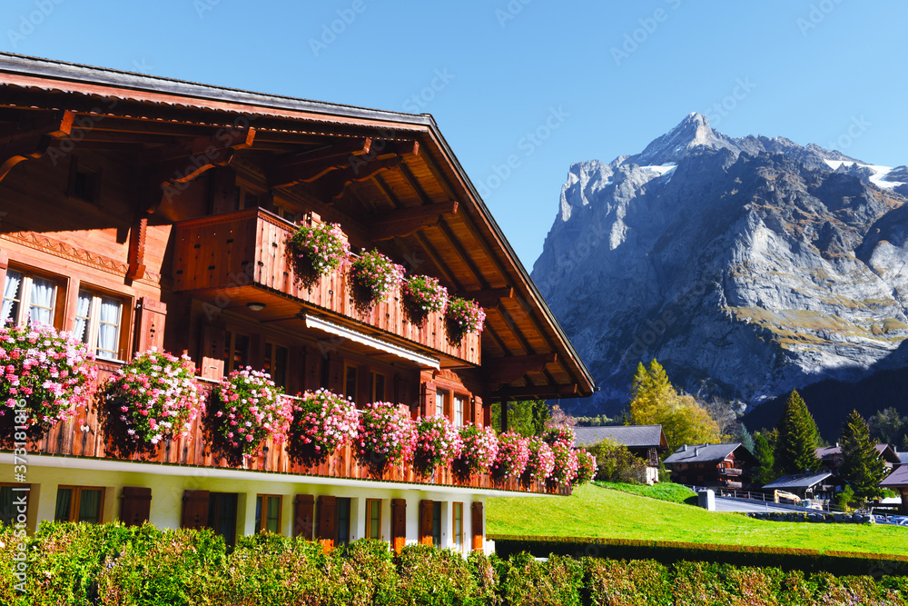 Picturesque autumn landscape with wooden house with flowers and mountains on background in Grindelwald village in Swiss Alps