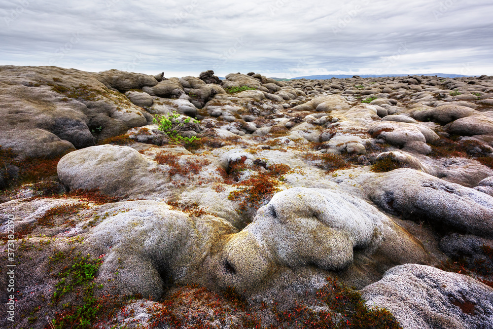 Iceland landscape with lava field covered with brown moss Eldhraun from volcano eruption and cloudy sky