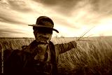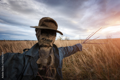 Awful scarecrow in dark cloak and dirty hat stands alone in a autumn field at sunset time. Halloween concept closeup
