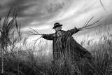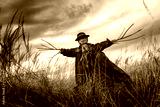 Frighten scarecrow in dark cloak and dirty hat stands alone in a autumn field. Halloween concept