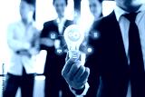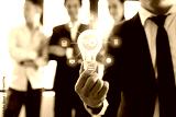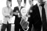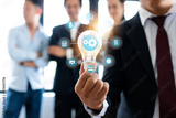 Business man holding light bulb with connection line icon with teamwork background, brainstorming and creative innovation concept