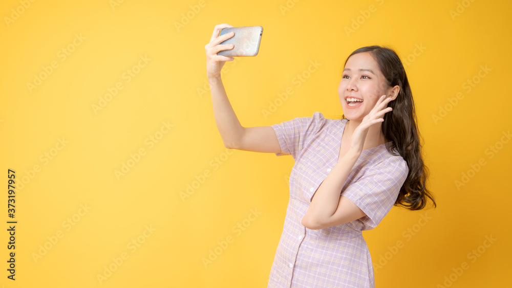 Asian beautiful girl taking selfie, Thai woman take photo by phone in studio on yellow background