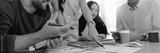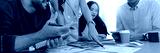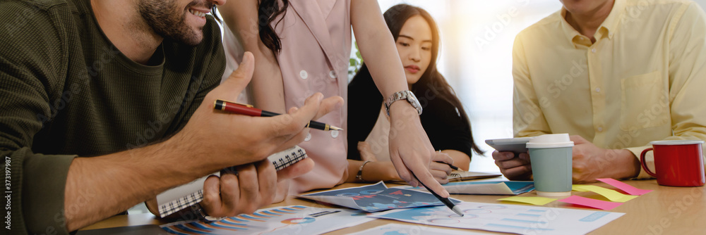 brainstorming and planning business team of young start up, group of people brief and analyze document on table, teamwork and creative concept