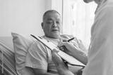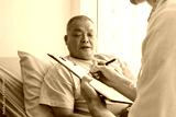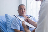 Doctor ask old patient man for symptoms and problem on body, writing information on medical paper