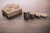 Save to real estate, property owner get money to home concept, small wooden house model on table