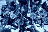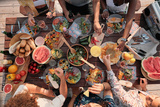High angle view of group of people sitting at the table and have dinner they celebrating the holiday outdoors