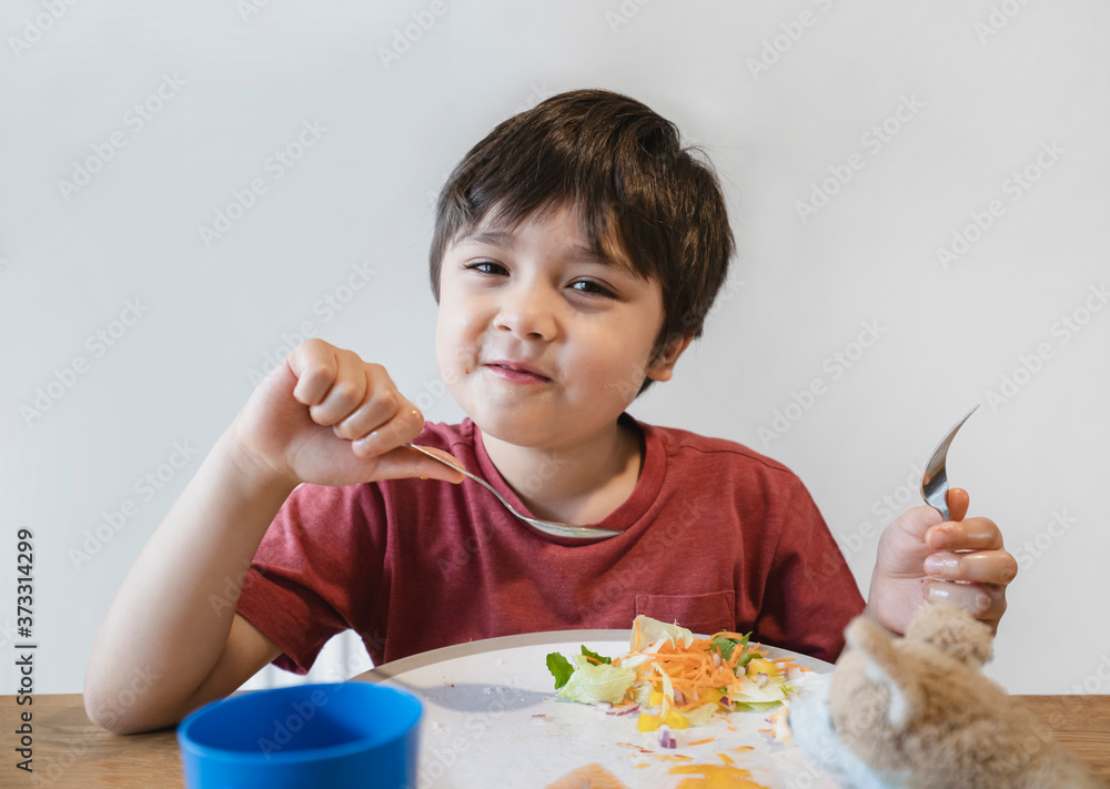Healthy kid eating mixed vegetables salad for his meal, Happy child looking at camera with smiling face while having lunch or dinner, Cute boy eating organic carrot, sweet bell and Chinese cabbage
