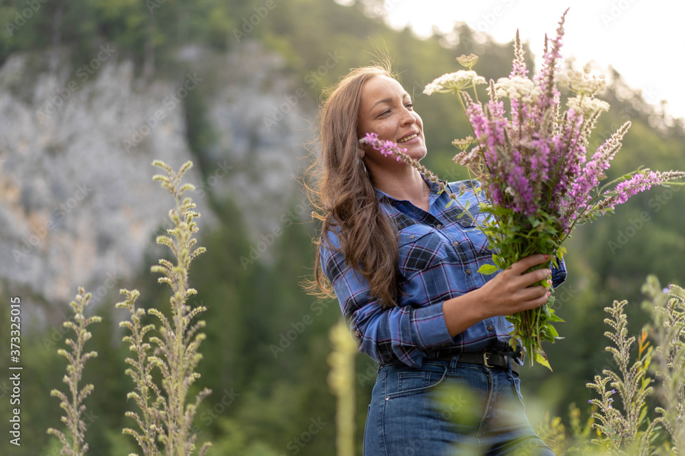 Portrait of young brunette beautiful woman in summer,holding bouquet of wild flowers in sunset.