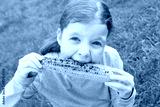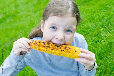 close-up, a girl, against a background of green grass, eating corn cooked on the grill