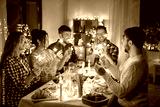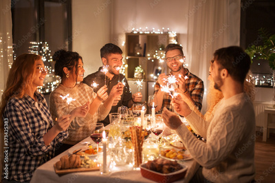 holidays, celebration and people concept - happy friends with sparklers having christmas dinner at home