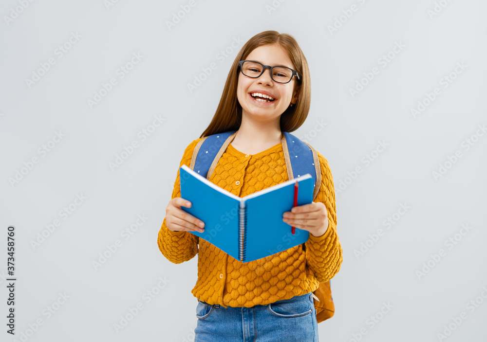 Kid with backpack on white background.
